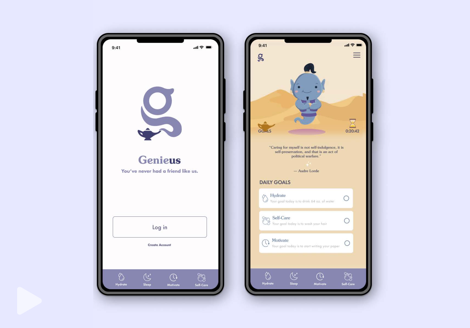 Genieus was a collaborative project in which I and two other students designed a self-care app. Loosely based on the idea that genie’s are always there for you when you need them, this self-care app allows you to take care of yourself with the help of a genie friend. Customize your genie any way you’d like, journal your self-care progress, and set three goals a day you wish to complete in order to better yourself and achieve the results you’re looking for.